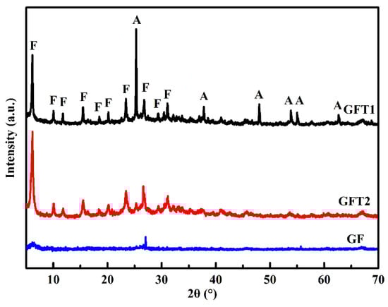 Figure 1 shows the XRD patterns of the geopolymer and the geopolymer-TiO2 composites synthesized by different preparation approaches. The geopolymer (GF) owns one “hump” located at around 26.0–28.0° (2θ). For GFT1, the diffraction peak of the anatase phase of titania appears at 2θ = 25.3° (JCPDS NO. 65-5714), and the other diffraction peak is ascribed to the faujasite zeolite (JCPDS NO. 26-0897). Compared to GFT2, the anatase phase of titania exhibits greater sharpness and more intensity (101) of reflection in the GFT1 sample. A part of TiO2 was lost in the two-step method during the activation process of TiO2 in dilute acid solution, while one-step method could avoid the waste of TiO2 on the surface of the support material. This means that the one-step method is more conductive to the preparation of the geopolymer-TiO2 composite.