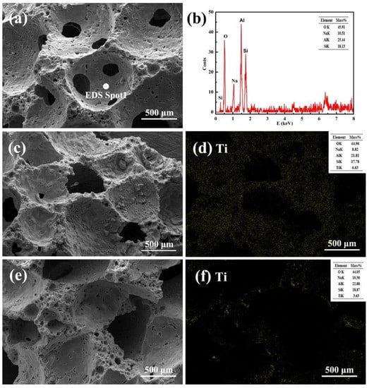 The surface morphology of GF without any TiO2 (Figure 2a,b) and GFT1 (Figure 2c,d) or GFT2 (Figure 2e,f) are presented in Figure 2. From Figure 2a, the highly interconnected pores are observed on the surface of the geopolymer, and the material contains 45.91 mass% O, 10.51 mass% Na, 25.44 mass% Al, and 18.13 mass% Si (Figure 2b). Figure 2c–f indicates morphological changes and distribution of Ti in composites with the use of different preparation treatments. The SEM images of GFT1 (Figure 2c) reveal that the excellent porous material formed by the uniform combination of TiO2 particles and CFA could be observed. From SEM elemental mapping images (Figure 2d), well-dispersed TiO2 particles (about 6.63 mass%) throughout the composite samples is related to the one-step method [13]. The porous material with a smoother surface and a more uniform pore is shown in Figure 2e, and a small amount of TiO2 (3.63 mass%, about half of one-step method) is supported on the surface of the porous material by the two step preparation process, which could be reflected by SEM elemental mapping images (Figure 2f). Different treatment methods caused not only a difference in the morphology of the composite materials, but also the amounts and the extent of dispersion of TiO2 in the composite, which is consistent with XRD analysis.