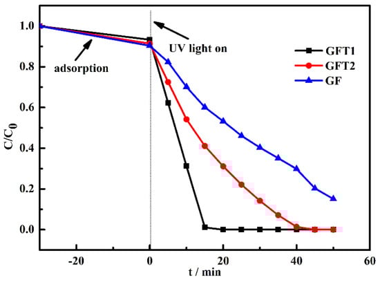 For exploring the influence of geopolymer and geopolymer-TiO2 composites prepared by two methods on the photocatalytic efficiency, the photocatalytic degradation performance of MB is compared. As shown in Figure 3, GFT1 synthesized by one-step convenient method exhibited better photocatalytic efficiency for MB. The degradation is completed in ca. 15 min. However, GFT2 synthesized by the two-step method presented lower activity than GFT1. The MB is degraded after 45 min of irradiation. Although the photocatalysis property of geopolymer without any TiO2 particles (GF) is relatively low, the material could fully degrade MB after 50 min. This may be caused by the high adsorption capacity of the geopolymer and some precious metals that have photocatalytic effect contained in the geopolymer [11,14]. The lower amount of anatase phase of TiO2 (Figure 1), and uneven dispersion of TiO2 on the surface of the GFT1 sample (Figure 2) suggest that the GFT1 sample could be a potential candidate for the treatment of industrially discharged wastewater.