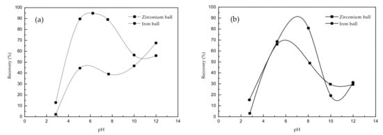 We noted that after the iron ball grinding, the existing iron ions on the surface of beryl and spodumene were the activation spots, which enhanced the interaction of minerals with an anionic collector. Therefore, under the same pH value, using sodium oleate as a collector, the flotation recovery of these two minerals after iron ball milling was significantly higher than after zirconium ball milling.