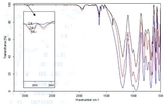 Infrared spectroscopy of beryl after iron media grinding. Note: 1# Beryl raw ore; 2# Beryl after iron dry grinding; 3# Beryl after iron wet-grinding.