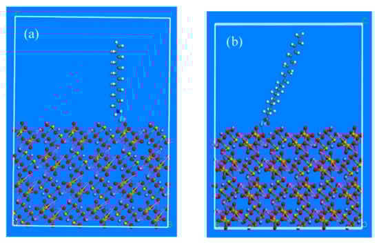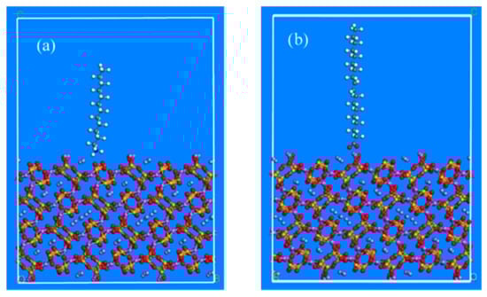 The adsorption model of spodumene between the lauryl amine and oleate: (a) Adsorption model between spodumene and lauryl amine; (b) adsorption model between spodumene and oleate. (Purple: Lithium)