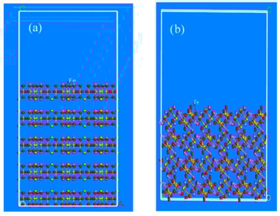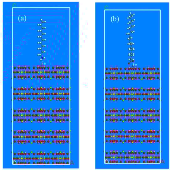 After iron ball grinding, we found that iron existed in the complicated pulp system in the form of various hydroxyl complexes. However, its stable range was limited, mainly at a pH of 1.5–3.0 []. Generally, most of the flotation experiments were conducted under the pH varying from weak acidity to alkalinity and within this range, iron existed in the form of Fe(OH)3. In order to illustrate the problem intuitively, the corresponding metal ion Fe3+ was introduced into the cleavage surface of the mineral after grinding. This formed the theoretical cleavage surface of beryl and spodumene minerals that is activated by metal ions, as shown in Figure 7a,b. Based on the above-mentioned adsorption models of beryl and spodumene surfaces the collector molecules were introduced after iron-grinding, as shown in Figure 8 and Figure 9. Figure 8a diagrams represent the adsorption models of dodecylamine cations, while Figure 8b shows the adsorption models of oleate anions on the beryl surface after iron balls grinding. The adsorption models of spodumene are shown in Figure 9, where Figure 9a diagrams represent the adsorption models of dodecylamine cations, while Figure 9b shows the adsorption models of oleate anions on the spodumene surface after iron balls grinding.