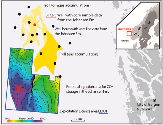 The Johansen Formation is a prospective CO2 storage reservoir offshore of Norway, located at burial depths of ca. 2100–3200 m. The operating hydrocarbon field “Troll” (yellow) is located north of the licensed CO2 injection area “EL001”. The cored well 31/2-3 is marked in red, and additional wells with wire line data from the Johansen Formation are marked as black dots. There are no well data available from EL001 as of yet, while an appraisal well is planned [26]. Source data are available at factmaps.npd.no, with suggested injection area and depth maps as shown in [29].