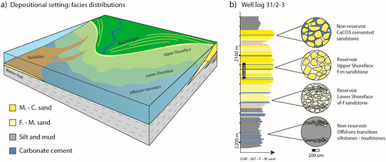 It is useful to define reactivity and make separate geochemical categories within the sedimentological framework. Changes in grain size and mineralogy (phase and occurrence) are particularly important. Bed stacks, or para-sequences (sensu Van Wagoner et al. [36,37]), may serve as a scale of reservoir subdivision, depicting depositional trends; e.g., upwards coarsening or fining trends in grain sizes, indicating changes in depositional regime with time. In the case of the Johansen Formation, reservoir grade sandstones recognised in wells are subdivided in lower shoreface (very fine-grained) and upper shoreface (medium-grained) deposits, interbedded with mudstones and/or carbonate cemented layers [28,29] (Figure 2).