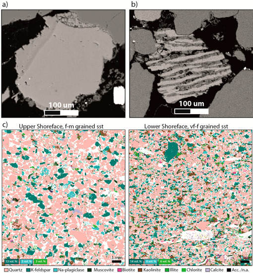 It is relevant to quantify the relative contributions and occurrences of feldspars (i.e., microcline/orthoclase/sanidine, albite, anorthite, and their solid solutions), as kinetics and dissolution potentials in the presence of CO2 vary significantly [46]. Anorthite is rarely preserved in clastic rocks, as it is chemically unstable and weathers easily [52]. Generally the feldspar assembly varies according to provenance and hinterland geology (i.e., felsic or mafic, igneous or methamorpic rock), and relative feldspar/quartz contents are higher in finer grained facies.