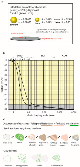 Parameterization of reactive surface areas: (a) Examples of grain geometries in relation to specific and reactive surface areas. For platy clay minerals Sr << Si, as reactions only occur along the edges; (b) Grain size distribution curves for typical lower (finer) and upper (coarser) shoreface facies. The small amounts of clay in reservoir sandstone and small amounts of available sample material makes separate clay analysis for detailed speciation difficult. Note that if disaggregating samples to analyse the clay fraction separately in XRD, a large part of the reactive phase may sort as sand (e.g., chamosite grain coats and ooids). Bulk XRD for the same samples show 6–9 wt% chlorite; (c) Reactivity quantification may be performed on bulk XRD data if typical mineral occurrences are described (vol %), and reactive surface area assigned. Example from the Johansen Formation: plagioclase, K-feldspar, chamosite, sorted from right to left according to reactivity in sand and clay fractions, respectively. Occurrence affecting reactive surface area is related both to sedimentary facies and diagenetic alterations (e.g., altered perthites).