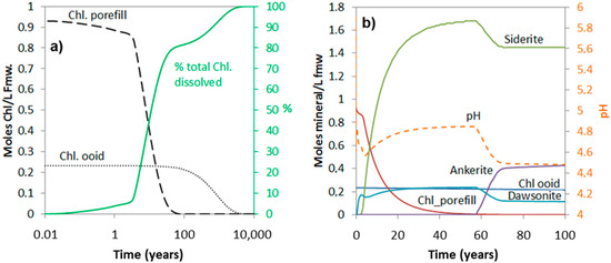 The simulations show that the amount of chlorite dissolved over short to medium time spans (<1000 years) very much depends on the amount that is high-reactive, i.e., the pore-filling and grain-coating chlorite (Figure 6 and Figure 7). The time it takes to completely dissolve the ooidal chlorite is approximately 10,000 years, also in the 20% ooid-chlorite case, and it is therefore no difference in the dissolved amount at this time scale (Figure 7a). Figure 7b shows pH changes and the amount of secondary carbonates (siderite, ankerite, and dawsonite) that form in the 20% chlorite-ooid case over 100 years. Siderite is the only Fe-carbonate to form, and the amount is proportional to the amount of chlorite that dissolved (1.8 moles of siderite formed for each mole of chlorite dissolved). The short delay of four years before onset of growth (Figure 7b) was due to the nucleation induction time. As kaolinite was defined to be at equilibrium with the formation water and dawsonite formed according to the local-equilibrium assumption, dawsonite formed immediately from the dissolved CO2 and the formation water Na+ and Al3+, but the growth rapidly stopped as no further Na+ was supplied (Figure 7b).