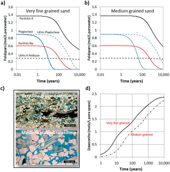 The feldspars in the Johansen Formation have been divided into five different types based on their chemistry and morphology. The lithic feldspars (plagioclase and K-feldspar) were assumed to be in a mineral mixture inside spherical fragments, and have reactive surface areas corresponding to the mineral fraction in the fragment. K-feldspar was also found along albite in perthitic fragments, and some plagioclase occurred as larger, preserved detrital grains. In these simulations we assumed that all grains (minerals and lithic) where in the same size, and we simulated two different settings: very fine grained sand (0.1 mm) corresponding to lower shoreface deposits, and medium grained sand (0.4 mm) being representative for upper shoreface deposits [29]. The difference in grain size leads to a four times larger reactive surface area for the very fine sandstone, and correspondingly faster dissolution of the feldspar grains and faster formation of the secondary dawsonite (Figure 8). In the very fine sand, detrital plagioclase dissolved completely within 50 years, leading to a corresponding dawsonite growth. In the medium-grained sandstone the same reaction takes four times longer, indicating that the dissolution occurs at far-from-equilibrium under-saturation and that the rate therefore is proportional to the reactive surface area. The difference in carbonatization potential is mainly seen on the short term, with the very fine sandstone having a potential of about 50% more CO2 bound and immobilized in dawsonite after 100 years (Figure 8). The difference is smaller in the long term (1000–10,000 years) as all Na-feldspars are eventually replaced by dawsonite. Including minor calcite contents (e.g., 1 wt%) causes some minor recrystallization of calcite to ankerite, but the overall storage potential does not change much. The K-feldspars were not completely dissolved after 10,000 years, but K-feldspars have earlier not been regarded as a source for dawsonite ([59] and references therein). Some recent data may, however, indicate that K-dawsonite may also form, but this is still highly uncertain [60]. The feldspars in intact lithic fragments are much less reactive compared to individual plagioclase grains, and it takes thousands of years to dissolve the lithic plagioclase even in the very fine sandstone.
