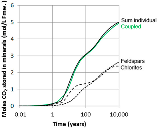The result shows that there is no significant difference between batch simulations using the complete reactive mineral assemblage, and the results of running separate simulations for the feldspars and chlorite and summing up the carbonatization potential (Figure 10). This indicates that pH of the simulations are also very similar, as pH strongly affects reaction rates. Such simplifications may be beneficial for running reactive-transport simulations of larger and more complex CO2 storage systems as the addition of kinetic reactions to flow simulations adds a substantial CPU load. All simulations were run at constant CO2 pressure, implying that the batch system is in communication with a CO2 source with sufficient CO2 to feed the necessary five moles required for a complete carbonatization of the feldspar-chlorite assemblage. The amount of CO2 required for a complete carbonatization at time scales when CO2 is still dominantly mobile (<100–1000 years) is about 2.5 to 3.8 moles/L Fmw (Figure 10). With a solubility of 1.28 moles/Kg Fmw in the Johansen Formation (SAFT v1 calculations: [59]), we need about 1.2 to 2.5 additional moles of CO2 per liter formation water for a complete carbonatization. This can be fed from CO2 trapped residually. The minimum volume of residual CO2 and percent residual required per liter pore water was estimated using a CO2 density of 680.13 kg/m3 [63]. The estimated amounts of residually trapped CO2 for 1.2 and 2.5 moles are then 7.2% and 13.9% respectively.