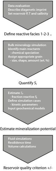 The workflow for parameterizing input for geochemical models described above is summarized in Figure 11. The main challenge with respect to geological characterization of saline aquifers is that hard data are often scarce. Thus, interpolation across large distances and/or burial depths from areas where data are available, to a less mapped, potential injection site are carried out. Absolute reactivity may often not be estimated, but taking into account facies changes (e.g., more clay and feldspar in finer grained facies) and diagenetic imprint (such as albitization with increasing temperature), some scenarios may be defined for initial geochemical bulk modelling including all phases and identification of main reactants. For the Johansen Formation the main cation donors were identified in bulk simulations as albite and Fe-chlorite [61]. Subsequently, estimating the facies-specific reaction potential through geochemical simulations takes a detailed description of the reactants into account. Solid-solutions must be specified and parameterized with suitable kinetic parameters [10,46] and assigned to one or more grain size/shape class occurrences (Figure 5).