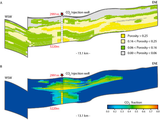 Fluid distribution relative to sedimentary facies with different mineralization potentials: (A) Interpreted facies distribution related to porosity class and interpreted from seismic attribute analysis (acoustic impedance). Upper shoreface (high porosity and permeability) in dark yellow, lower shoreface (intermediate porosity and permeability) in light yellow. Non-reservoir siltstones and mudstones in green and grey. Model described in [28]; (B) fluid distribution at 100 years, after 50 years of injection 3 Mt/y CO2 through a well perforated in the lower half of the reservoir. In this case 16% of CO2 was dissolved, 38% residually trapped [28].