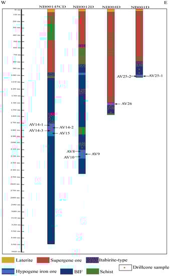 - Silva, R.F.E.; Lobato, L.M.; Rosiere, C.; Hagemann, S.; Zucchetti, M.; Baars, F.; Morais, R.; Andrade, I. A hydrothermal origin for the Jaspilite-hosted, giant serra norte iron ore deposits in the Carajas mineral province, Para state, Brazil. In Banded Iron Formation-Related High-Grade Iron Ore; Society of Economic Geologists: Littleton, CO, USA, 2008; pp. 255–289. [Google Scholar]
