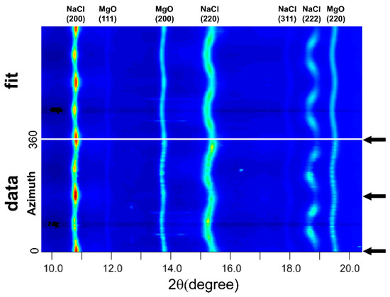 An unrolled diffraction image and materials analysis using diffraction (MAUD) fit of the 20% MgO + 80% NaCl sample. Black arrow indicates the compression direction. Sinusoidal distortion of diffraction line indicates lattice strain. Systematic intensity variation along azimuth indicates texture.