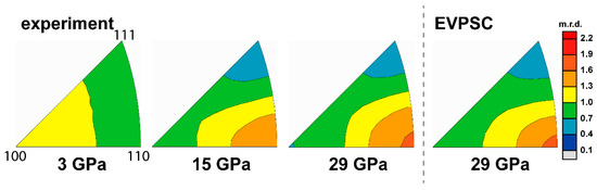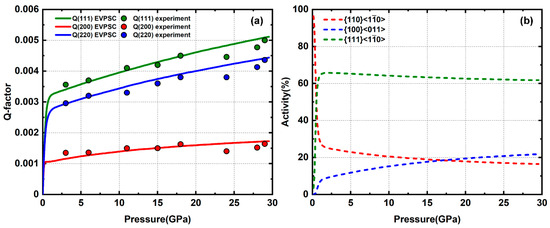The sample composed of pure NaCl powder was compressed up to 29 GPa. Lattice strain of the diffracted planes are in an order of Q(111) > Q(220) > Q(200) (Figure 2a). NaCl gradually develops a (110) compression texture (Figure 3), similar to that observed in compression experiments at 400 °C [43] and consistent with the complementary (111) and (100) texture observed in room temperature extension experiment [44,45]. Based on previous self-consistent modeling results, a high activity of slip will give a (100) compression texture [46] while and give an intense (110) texture [25]. A linear CRSS increase with pressure is given to each slip system in order to fit the Q-factors increase, which is caused mainly by pressure hardening (Table 1). Based on the modeling results, a high activity of slip combined with minor and give the best fit for both texture and Q-factors (Figure 2b). Although the initial CRSS for used in modeling is almost half of (Table 1), most of the plastic strain is still accommodated by the system, similar to VPSC simulation results for shear deformation of halite [47]. In cubic crystals, there are only six equivalent slip modes for system while there are 12 for . Thus, slip on {110} planes is more likely to be suppressed due to an unfavorable Schmid factor, than slip on {111} planes.
