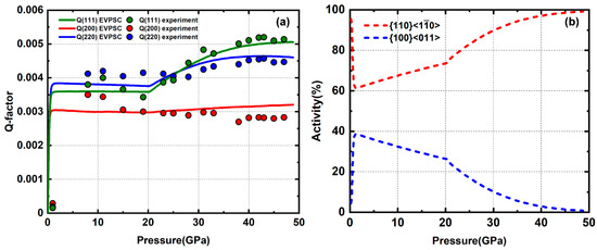 is the local stress tensor. The Schmid factor describes how stress is resolved onto a slip system. When the stress resolved onto a given slip system is close to the threshold value , deformation will occur on the slip system. This critical resolved shear stress (CRSS) describes the strength of the individual slip systems and to a large extent controls slip systems activity. Due to grain–grain interactions and microstructural effects, CRSS in EVPSC will not be equivalent to single crystal CRSS, but are rather an effective polycrystal CRSS. In the self-consistent scheme, the constitutive equation needs to be linearized. There are several possible schemes, namely tangent, affine, and secant [30]. Affine is used in this study since it allows the choice of different stress exponents for the various phases. At each deformation step, each inclusion interacts with the HEM and macroscopic properties get updated iteratively until the average stress and strain of all inclusions equals the macroscopic stress and strain. Compared with elastoplastic self-consistent (EPSC) [31] and viscoplastic self-consistent (VPSC) [32], both elastic and viscoplastic behavior are considered in EVPSC. Lattice strains (Q-factors) and grain rotation (texture) are modeled together, giving more constraints on slip system activities. The details of EVPSC modeling for high-pressure deformation experiment can be found in [25]. Since strain and pressure increase simultaneously in DAC experiments, it is not possible to separate the pressure and strain hardening effects on CRSS. Both are included in the pressure dependence of the CRSS. In this study, , where is the initial CRSS and is the pressure dependence of CRSS. Sample strains in DAC experiments are typically not measured, but a reasonable axial strain value (~24%), which is based on the texture intensity of the pure NaCl sample, is assumed in the EVPSC models of the multiphase samples. Single crystal MgO/NaCl elastic constants and their pressure dependence from Zha et al. (2000) and Whitfield et al. (1976) [33,34] are used for the simulations.