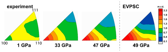 The sample of approximately 20% MgO plus 80% NaCl is compressed up to 24 GPa. The lattice strains of NaCl do not change significantly with addition of MgO. Q-factors are still in an order of Q(111) > Q(220) > Q(200) with values that resemble the pure NaCl sample (Figure 6a). However, NaCl gradually develops a (100) texture (Figure 7) in contrast with the (110) texture observed for pure NaCl. Among the available NaCl slip systems, a (100) compression texture is generated by a high activity of the slip system. Thus, it is likely that there is a dominant slip system transition from to caused by the addition of strong MgO. For MgO, the lattice strains are much lower than in the pure MgO sample. All Q-factors generally increase with pressure (Figure 6a), which is not observed in the same pressure range in pure MgO (Figure 4a). There is no observable texture development of MgO during compression (Figure 7). Since dislocation glide leads to grain rotation, a lack of texture development likely indicates that there is little to no plastic deformation in MgO. Given the low Q-factors, the stress in MgO is also likely below the yield stress. Low values of experimental lattice strains and lack of texture development indicate that MgO deforms elastically. For dominant slip on in NaCl/MgO, the spin of symmetric variants (e.g., (110)[–110] and (-110)[110]) cancel each other’s rotation, resulting in slow (100) compression texture evolution until strain is large enough to significantly flatten the grains [49]. In our EVPSC simulation, the grain shape is initially flattened in order to yield a faster (100) texture evolution within the ~24% axial strain imposed. Based on modeling results, dominant slip combined with auxiliary slip for NaCl and almost no slip for MgO give a good fit to the experiment lattice strain and texture (Figure 6b).