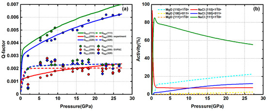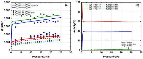 (a) Experiment and modeled Q-factors of pure MgO; (b) slip system activity; replotted from [48].