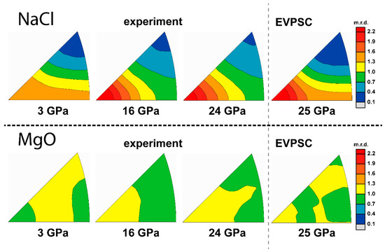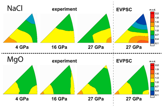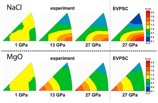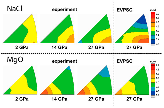 The sample composed of pure MgO powder was compressed up to 47 GPa and modeled using EVPSC in a separate study [48]. Lattice strains are in an order of Q(220) > Q(111) > Q(200) at relative low pressures (<20 GPa). Above 20 GPa, Q(111) increases faster than Q(220) with pressure and gradually surpasses Q(220) (Figure 4). A reordering of Q-factors usually indicates a change of slip system activity. MgO gradually develops an intense (100) texture with increasing pressure (Figure 5). Based on modeling results, both and are activated with a ratio of ~60:40 below 20 GPa. Above 20 GPa, the reordering of Q-factors is caused by increasing activity of the slip system due to pressure hardening of the system. This is fulfilled by giving a steep increase of CRSS with pressure (Table 1). Accompanying this slip system activity change at high pressure is a rapid increase in the measured differential stress value. Based on our modeling results on pure MgO and NaCl, the rheology contrast between these two materials is ~14.