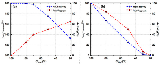 Activity and average strain evolution with phase proportion; (a) NaCl; (b) MgO.