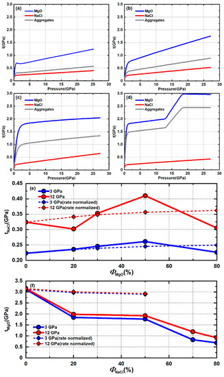 Stress of the aggregates, NaCl, and MgO under varying phase proportions: (a) 20% MgO + 80% NaCl; (b) 30% MgO + 70% NaCl; (c) 50% MgO + 50% NaCl; (d) 80% MgO + 20% NaCl; stress of individual phase under varying phase proportions: (e) NaCl; (f) MgO.