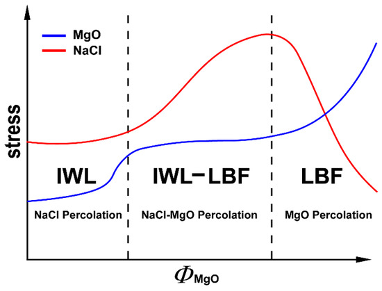 Stress evolution of individual phases with the MgO phase proportion. Blue line is for MgO and the red line is for NaCl.