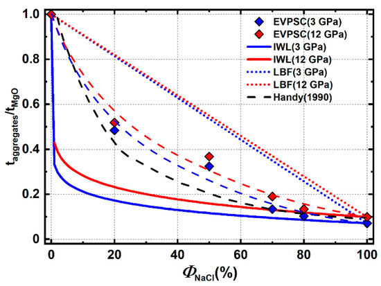 Aggregate stress generally decreases nonlinearly as the weak NaCl phase proportion increases (Figure 18). The addition of only 20% NaCl lowers the aggregate stress by 50% compared to pure MgO. With additional NaCl, aggregates stress decreases but with a more gradual slope. When NaCl dominates the aggregate’s composition, aggregate stress is not sensitive to added NaCl. Aggregate stress under the IWL and LBF microstructures are also estimated using equations from [4], which can be treated as upper and lower bounds for true aggregate stress (solid and dotted lines in Figure 18). For materials like MgO and NaCl, which have a high yield strength contrast, LBF stress is reasonable only in a very narrow range of phase proportions that lie close to pure MgO. IWL stress is close to the aggregate stress when the NaCl phase proportion is over 70%, which is where MgO no longer percolates through the NaCl matrix. At intermediate compositions, aggregate stress lies between LBF and IWL bounds. At low NaCl phase proportions, the value is closer to the LBF end member and at high NaCl phase proportions it is closer to the IWL bound. Aggregate stress for low and high NaCl phase proportions in this study is in good agreement with predicted values under similar yield contrast, as given in [3]. At intermediate phase proportions, the aggregate stress of Handy is lower than that of this study. This may be due to foliation of the weak phase in the highly strained geologic samples studied by Handy (1990) [3].