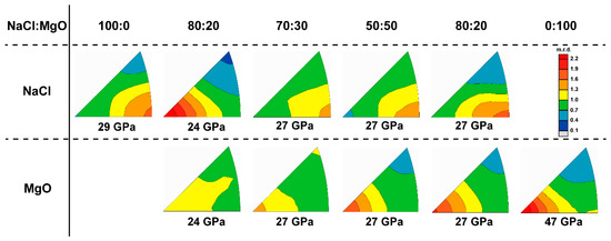 The sample composed of approximately 30% MgO plus 70% NaCl is compressed up to 27 GPa. The Q-factors of NaCl are still in an order of Q(111) > Q(220) > Q(200) (Figure 8a) and slightly higher than the pure NaCl sample. At 4 GPa, where the first diffraction image is taken, NaCl has already developed a (100) texture, corresponding to a dominant slip. As deformation continues, the texture gradually weakens then shifts to (110) (Figure 9), due to activation of the slip system. The Q-factors of MgO are still relatively low compared with pure MgO. However, MgO gradually develops a weak (100) texture (Figure 9). This indicates that MgO starts to deform plastically in the 30% phase proportion sample. This is near the percolation threshold; thus, MgO–MgO grain contacts are likely to occur in this sample. Experiment textures of MgO/NaCl at 4 GPa are used as starting textures in these models. CRSS values used for NaCl are similar to the pure NaCl simulation, resulting in a dominant slip with minor auxiliary and . For MgO, is the only active system with only minor 2% activity, resulting in slight (100) texture development (Figure 8b).