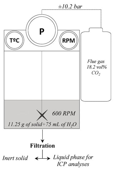 Dissolution reactions were performed using carbonation conditions in order to evaluate thermal treatment effects on the developing process. Carbonation reactions were conducted in a 300 mL stirred reactor, model 4561 of Parr Instrument Company (Moline, IL, USA) [29,31]). The tests were performed using a certified composition gas of 4.0 vol% O2 and 18.2 vol% CO2, balanced with N2, simulating cement plant flue gas. The pulp density was set to 15% (150 g·L−1), with a volume of 75 mL of water, 11.25 g of solid and a gas phase volume of 225 mL, as optimized by Mercier et al. [29]. A batch of 10.2 bar of gas was introduced into the stirred reactor and was allowed to react with the pulp for 15 min at room temperature 22 °C ± 3 °C with the agitation sets to 600 RPM (Figure 1). As the reaction happens, the pressure decreased between 0.1 and 3.5 bar, depending on the amount of gas initially introduced. At the end of each batch, the pulp was filtered to obtain the liquid for chemical composition analyses. The reactivity of the eight thermally treated samples were tested along with an untreated sample (U). They were only observed throughout the proportion of magnesium leached from the solid during the reaction, using Equation (4) [Mg]liq corresponds to the measured concentration of Mg2+ at the end of the reaction, V and m are the volume of the solution and the mass of solid, respectively, and CMg is the measured concentration of Mg in the post-thermal treatment solid. Carbonates were not precipitated from the solution as thermal activation impacts on the Mg leaching. Mg analysis was performed on liquid sample after reaction. The liquid fraction was obtained after filtration of the resulting pulp. Consistency in the procedure was validated by performing mass balance to highlight any precipitation occurring during manipulation or during the pressure release of the vessel.