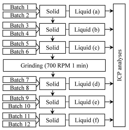 The chemical composition of the starting material is given in Table 2. The chemical composition of liquid and solid samples was obtained using inductively coupled plasma-atomic emission spectrometry (ICP-AES) analysis (Varian, Palo Alto, CA, USA). Solid samples were first fused using the Claisse Method [37]. Loss on ignition (LOI) was obtained from mass difference after placing the sample into a ceramic crucible inside a muffle furnace for 6 h at 1025 °C.