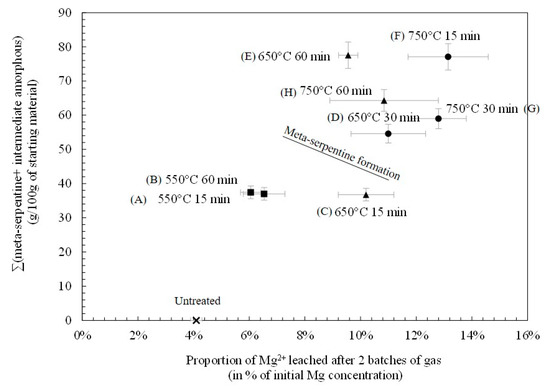 It is known that the amount of Mg2+ available for leaching will directly control, along with the amount of CO2 treated, the quantity of carbonates being precipitated from the liquid phase after carbonation [30,31]. This study focuses on the proportion of Mg2+ leached from thermally treated serpentine samples. Figure 3 shows the mass of intermediate amorphous components and of meta-serpentine added up and plotted against the proportion of Mg2+ leached into the liquid phase during the carbonation reaction. As the amount of amorphous components increases from none (U- untreated sample) to 77 g/ 100 g of starting material (F—750 °C 15 min), the proportion of Mg2+ leached during two batches of gas increases too, respectively from 3.3 wt % to 13.5 wt % of initial Mg2+ concentration in solid. Samples D, G and H show similar proportions of Mg2+ leached and a close amount of amorphous components. However, initial serpentine constitutes a third of the former composition, whereas forsterite is formed in the two latter. As observed in previous studies at 650 °C, the solubility of Mg2+ ions is first increased by thermal treatment until it is reduced with the decreasing content of amorphous phases and the formation of forsterite. The amount of Mg2+ leached from the heat activated serpentine appears to be linearly dependent on the proportion of amorphous phases.
