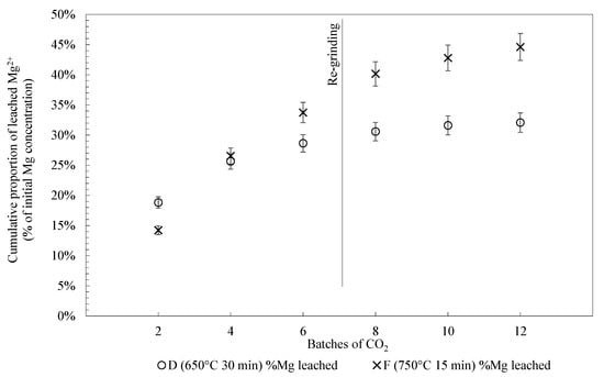 Thermal treatment conditions of samples D and F (650 °C for 30 min and 750 °C for 15 min) are chosen to be tested on successive batches as they respectively are the recommended conditions in literature [22] and the conditions giving the highest proportion of Mg2+ leached after two batches of gas in our conditions. Figure 4 shows the cumulative proportion of Mg2+ leached after twelve batches of gas. After two batches of gas, the proportion of Mg2+ leached demonstrates a significant discrepancy from the previous results and the present one. Indeed, the sample treated at 650 °C for 30 min shows a similar proportion of Mg2+ leached to the one treated at 750 °C for 15 min. After 4 batches, the sample treated at 750 °C for 15 min is catching up with a proportion of Mg2+ leached higher by 5 wt % compared to the other sample. At the end of the 12 batches, 44.6 wt % of Mg2+ has been leached from the sample treated at 750 °C for 15 min against 32.4 wt % for the one treated at 650 °C for 30 min. For the sample treated at 650 °C for 30 min, the proportions of Mg2+ leached reached a plateau close to 0.5 wt % during the tenth batch, suggesting that almost all of the Mg2+ available in the present dissolution conditions might have been leached. This occurred with at 750 °C after 15 min, which indicates that the plateau has not been reached yet, suggesting that more batches of CO2 could allow a higher proportion of Mg2+ leached. As the solution is refreshed for every two batches of gas, the limiting factor is the availability of the Mg2+ and not the saturation of the solution.