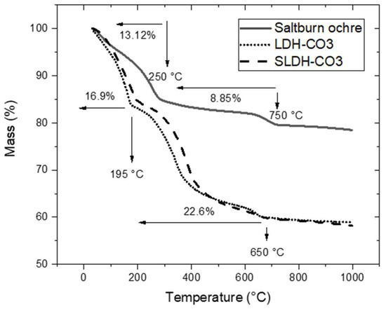 TGA analysis of the Saltburn ochre was performed to observe if any organic matter was present within the sample. The plot is shown in Figure 1, together with the one belonging to the LDH-CO3, and it can be observed that the materials have very different mass loss profiles. The ochre sample loses mass in two main steps, one in the region of the 200 °C and the next one in between 200 and 650 °C. The first mass loss is due to the removal of physiosorbed water on the sample, whereas the second one relates to the dehydroxylation of the sample, as all the α-FeO(OH)(goethite) was completely transformed to α-Fe2O3 (hematite) [21,22,23], with the latter confirmed by XRD data of a calcined Saltburn ochre sample at 800 °C (see Figure S2).