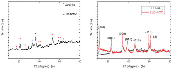 Ochre is mainly composed of goethite, as observed in Figure 2a, and all the mass loss observed in Figure 1 is due to the loss of adsorbed water and the dehydroxylation of the sample, with the goethite completely transformed into hematite when temperatures reached 700 °C and above [17,21,23]. When observing the TGA curve for both the LDH-CO3 and SLDH-CO3, literature report a classical two stages decomposition in hydrotalcite-like materials, with the first mass loss due to the physiosorbed and interlayer water, which ends at around 200 °C, and a second mass loss from 200 °C to approximately 600 °C due to the dehydroxylation and decomposition of the carbonate anion in the interlayer [20,24,25,26]. Both processes can be considered endothermic and dependent on different factors, such as the cation ratio, pre-treatment of the samples and type of anions in the interlayer [20].