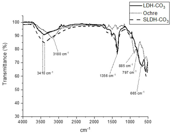 The FTIR data provided further information about the LDH materials, with hydrogen-bonded O–H group stretching evident in the region 3000 to 3500 cm−1 [26,33], related to the existence of water in the interlayer, with no similar high wavenumber vibrations in the ochre spectra, where interlayer regions are not present. The presence of a peak at 1356 cm−1 related to the carbonate anion is due to the anti-symmetric stretching of the C–O bond [20,29]. The data is characteristic of LDHs [42,43], supporting the XRD data above regarding a successful synthesis of the desired LDH material. The latter can also be supported with the FTIR plot of the Saltburn ochre observed in Figure 3, with the characteristic goethite peaks at 797 and 885 cm−1 [35,36,37] and their total disappearance in the LDH spectra. No sharp absorbance was observed circa 3700 cm−1, which would also indicate the presence of a brucite (Mg(OH)2) phase.