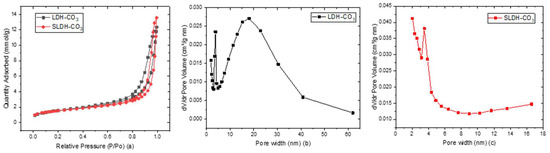 The materials exhibited a classical Type IV isotherm related with mesoporous materials [38,39] with a narrow hysteresis loop, which means that the pores are uniformly distributed in a narrow arrangement [38,39]. This distribution was confirmed by Figure 4b for the LDH-CO3, in which it can be observed that the majority of the pores are distributed between a width of 9 and 40 nm. On the other hand, the majority of the mesopores for the SLDH-CO3 were up to 20 nm in width. A summary of the specific surface, pore volume as well as pore size for both samples can be observed in Table 2.