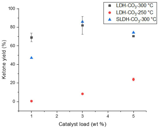 The catalyst load and the temperature at which each reaction was performed have a direct impact on the formation of ketone. Thus, when no catalyst was used, ketone production did not occur. However, in the presence of catalytic amounts of the LDH materials, the ketone started to be generated, in lower yields at lower temperatures (250 °C) and in much higher yields when the temperature increased (300 °C), as shown in Figure 5. It should be noted that the raw Saltburn ochre did promote the ketonic decarboxylation of lauric acid; however, the ketone yield was low (16% at 300 °C) when compared with those obtained with the Mg/Fe LDH-CO3.