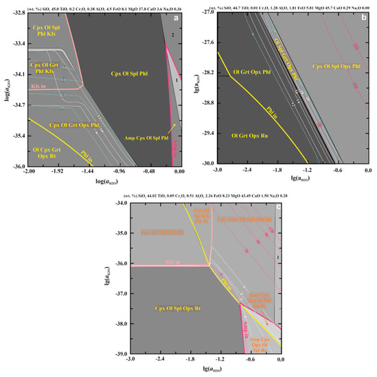 The slopes of phlogopite-forming reactions show that a high H2O activity is favorable for peridotite transformation at lower K2O activity (Figure 2a). This conclusion is qualitatively consistent with the conclusion by Sokol et al. [53,54] that K2O concentration is negatively correlated with the H2O/(H2O + CO2) ratio that is required for phlogopite stabilization in peridotite. Within a narrow log(aK2O), all associations of metasomatized garnet peridotite are stable, from unaltered lherzolite Opx + Ol + Grt + Cpx + Ru (rutile appears since no Ti substitutions are accounted in model pyroxene, garnet and olivine solid solutions) through phlogopite-bearing garnet peridotite Grt + Opx + Phl + Ol + Cpx to Cr-spinel-bearing phlogopite wehrlite Phl + Ol + Cpx + Spl. Spinel forms via decomposition of Cr-bearing garnet, whereas mode of clinopyroxene increases via phlogopite-forming reactions.