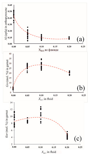 Therefore, at 40 mol. % of KCl in the fluid, phlogopite and clinopyroxene only are present in the run products. Phase compositions regularly vary with the increase of the salt content in the fluid (Figure 4a,b). The Al-content of orthopyroxene decreases in correspondence with the reaction (4) (Figure 4a). Grossular content in garnet increases with the increase of the KCl concetration in the fluid up to 10 mol. % demonstrating a domination of the reaction (2) over the reaction (3) (Figure 4b). However, further increase of the KCl concentration up to 20 mol. %, the grossular content in garnet decreases reflecting simultaneous operation of these reactions (Figure 4b).