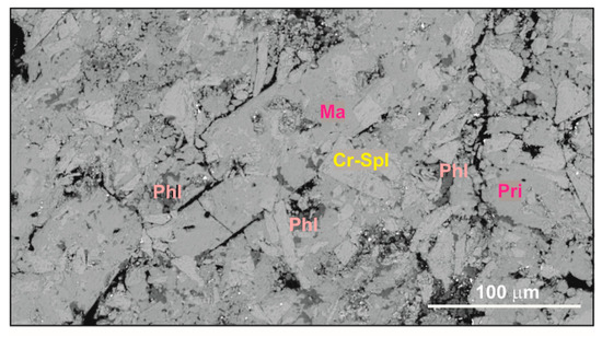 Phlogopite coexisting with mathasite and priderite in the run products of interaction of Cr-bearing spinel and rutile with the fluid H2O–CO2–K2CO3 at 5 GPa [98]. Ma—mathiasite, Pri—priderite, all other mineral abbreviations are from [48].