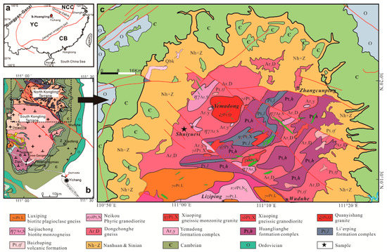 - Gao, S.; Yang, J.; Hu, Z.C.; Yuan, H.L.; Gong, H.J.; Li, M.; Xiao, G.Q.; Wei, J.Q. Age and growth of the Archean Kongling terrain, South. China, with emphasis on 3.3 Ga granitoid gneisses. Geochim. Cosmochim. Acta Suppl. 2011, 72, 153–182. [Google Scholar] [CrossRef]