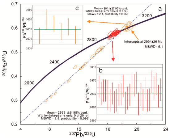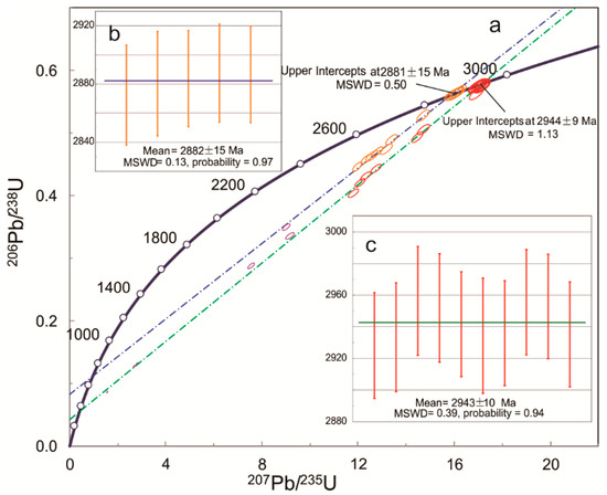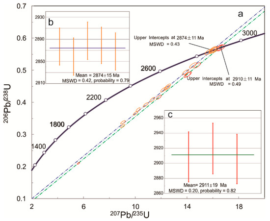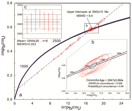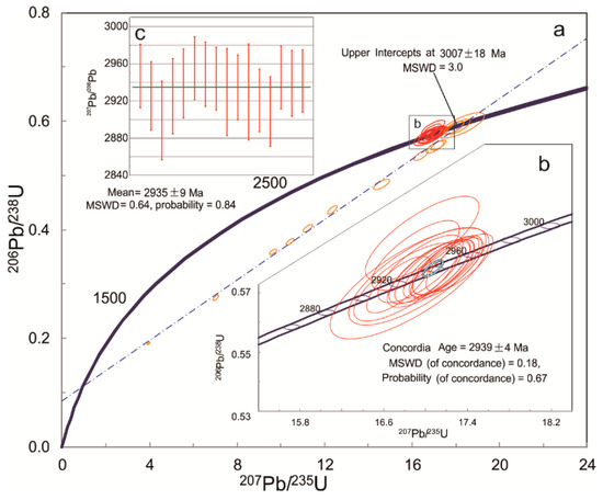 - Ludwig, K.R. Isoplot 3.00: A geochronological toolkit for Microsoft Excel. Berkeley Geochronol. Cent. Spec. Publ. 2003, 4, 1–70. [Google Scholar]