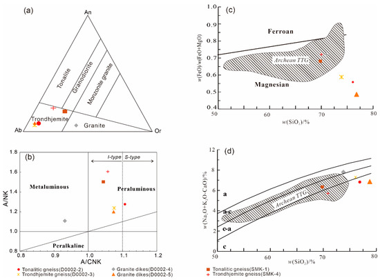 - Barker, F.; Arth, J.G. Generation of trondhjemitic-tonalitic liquids and Archean bimodal trondhjemite-basalt suites. Geology 1976, 4, 596–600. [Google Scholar] [CrossRef]