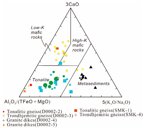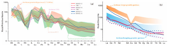 - Qiu, X.F.; Ling, W.L.; Liu, X.M.; Lu, S.S.; Jiang, T.; Wei, Y.X.; Peng, L.H.; Tan, J.J. Evolution of the Archean continental crust in the nucleus of the Yangtze block: Evidence from geochemistry of 3.0 Ga TTG gneisses in the Kongling high-grade metamorphic terrane, South China. J. Asian Earth Sci. 2018, 154, 149–161. [Google Scholar] [CrossRef]