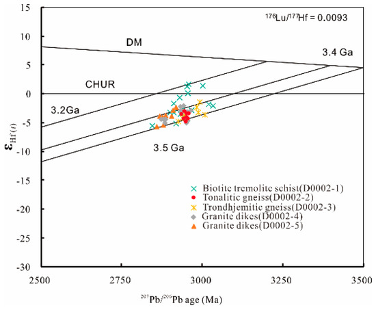 - Wu, F.Y.; Zhang, Y.B.; Yang, J.H.; Xie, L.W.; Yang, Y.H. Zircon U–Pb and Hf isotopic constraints on the Early Archean crustal evolution in Anshan of the North China Craton. Precambrian Res. 2008, 167, 339–362. [Google Scholar] [CrossRef]