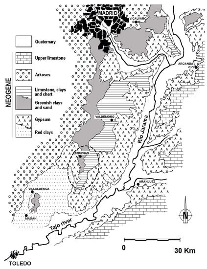 Geological map of the Madrid Basin. The figure corresponds to the square in Figure 1. Studied areas: dotted ellipses. Modified from Reference [].