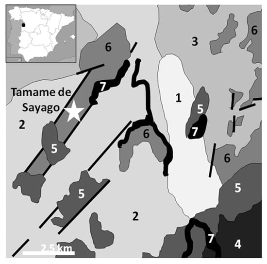 Geological map of the Tamame de Sayago bentonitic deposit. 1, 2, and 3: Variscan granites. 1: Coarse-grain leucogranite; 2: fine-grain leucogranite; 3: coarse-grain biotitic granitoid. 4, 5, and 6: Tertiary sedimentary materials. 4: Sands and lutites with paleosoils; 5: Paleocene siderolithic series with conglomerates, sands, and lutites; 6: Eocene–Oligocene detrital series with conglomerates, sands, and lutites; and 7: Quaternary sediments. Modified from Reference [].