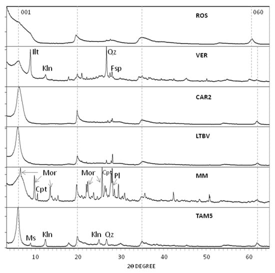 The mineralogical composition of the bentonites from the Morrón de Mateo deposit is a bit more complex. As shown in Figure 9, zeolites (clinoptilolites and mordenite) appeared as the main impurities, together with plagioclase. A similar mineralogical composition was identified in Reference [], in addition to variable amounts of amphibole, biotite, calcite, and K-feldspar in the poorest samples of smectite. Zeolites and small amounts of amphiboles and calcite have also been found in this deposit [].