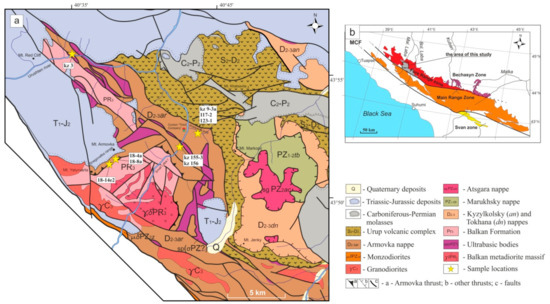 (a) Local geological scheme of the Blyb salient area (compiled on base of map 1:200,000 of [16] with changes); (b) tectonic scheme of the pre-Mesozoic basement of the Greater Caucasus. MCF—Main Caucasus Fault.