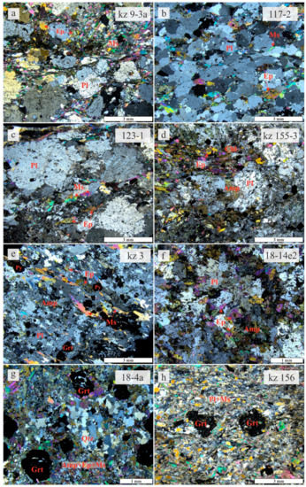 Thin sections of studied Armovka Formation rocks in transmitted, cross-polarized light. Mineral abbreviations are after [25]: Amp—amphibole; Chl—chlorite; Ep—epidote; Grt—garnet; Ms—muscovite; Pl—plagioclase; Py—pyrite; Qtz—quartz. (a−c) Epidote gneisses with plagioclase porphyroblasts, (d) epidote−amphibole gneiss with plagioclase porphyroblasts, (e) garnet–epidote–amphibole gneiss, (f) epidote amphibolite, (g) garnet–epidote amphibolite with garnet porphyroblasts and superimposed quartz vein, (h) garnet–muscovite blastomylonite with garnet porphyroblasts and foliation due to orientation of plagioclase and muscovite.